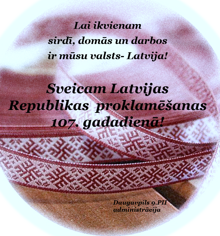 Sveicam mūsu iestādes pedagogu, darbiniekus, izglītojamo vecākus un sadarbības partnerus Latvijas Republikas proklamēšanas 107. gadadienā!