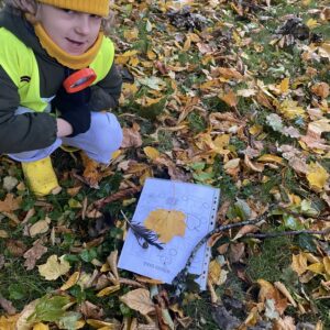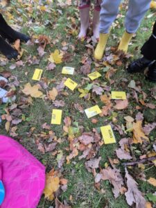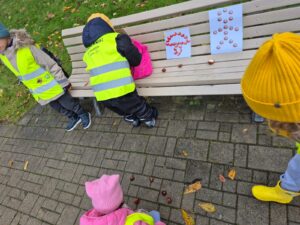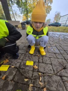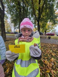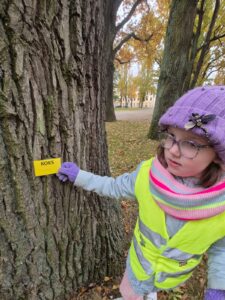 Ekskursijas laikā bērni vēroja kokus, meklēja dažādu koku lapas un piedalījās dabas novērošanas uzdevumos, izmantojot savas lasītprasmes spējas salika koku nosaukumus no zilbēm. Zem koku lapām bērni atrada kartītes ar uzrakstiem, kuras izlasot bērniem vajadzēja atrast dabā konkrēto priekšmetu.