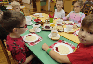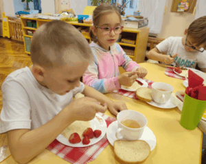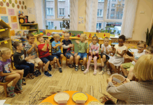 Pēc tam mēs visi kopā skaitījām labi zināmo četrindīti par putras vārīšanu “Vāru, vāru putriņu…”, jautri ritmiski atkārtojot pantiņa vārdus. Tas dabiski noveda pie visinteresantākās diskusijas: kāpēc pēdējam pirkstiņam putra netika? Bērni izteica dažādas gudras domas – varbūt pirkstiņš nebija palīdzējis, varbūt aizgulējies, vai arī… putras katlā vienkārši vairs nebija! Šī saruna ne tikai attīstīja bērnu runas prasmes, bet arī veicināja izpratni par dalīšanos un draudzību.