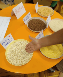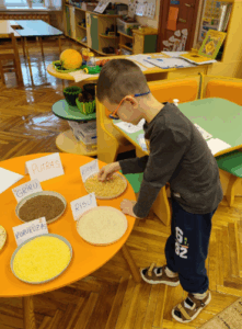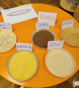 Dienu sākām ar izzinošu stūrīti, kur bērni tika iepazīstināti ar graudaugu un putraimu bagāto pasauli. Pie mazajiem pirkstiņiem pabija gan griķi, gan baltie rīsi, gan trauslās auzu pārslas, gan apaļie zirņi un citi. Bērni ar interesi pētīja, taustīja un salīdzināja dažādos putraimus, secinot, ka putra nemaz nav tikai viena veida!