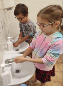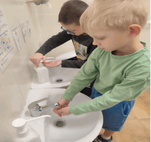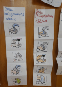 Diena sākās ar radošu darbnīcu. Bērni ar skolotājām Edītes un Karīnas palīdzību ne tikai zīmēja, bet arī paši veidoja roku mazgāšanas shēmas – vienkāršas, krāsainas instrukcijas, kas soli pa solim parādīja, kā pareizi mazgāt rokas (plaukstas, pirkstu starpas, īkšķi, plaukstas virspusi). Katram bērnam bija iespēja pie izlietnes praktizēt tikko izveidotās shēmas. Bērni atklāja, ka ar ziepēm jādraugojas vismaz 20 sekundes, tās kārtīgi izberžot. Bērni ar lepnumu izvietoja savus mākslas darbus – atgādnes pie grupiņas izlietnes un tualetes telpās, lai ikviens varētu gūt iedvesmu.
